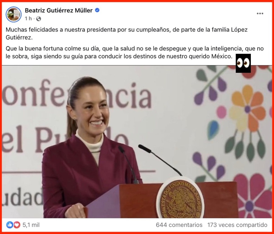 MÉRIDA, Yucatán.- Es obvio que a la presidenta Claudia Sheinbaum no le sobra la inteligencia, como atinadamente dijo Beatriz García Muller, esposa de AMLO, cuando la felicitó por su cumpleaños.