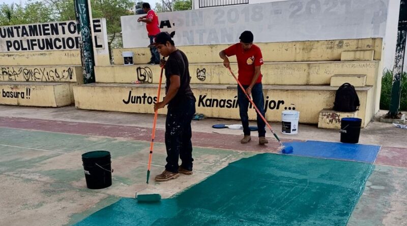 Los trabajos están a cargo de la Dirección de Imagen Municipal del Ayuntamiento de Kanasín y consisten en pintar las gradas, la cancha municipal, reparación de la malla perimetral, reparación de los tableros de básquetbol, cambio de luminarias, entre otras acciones.