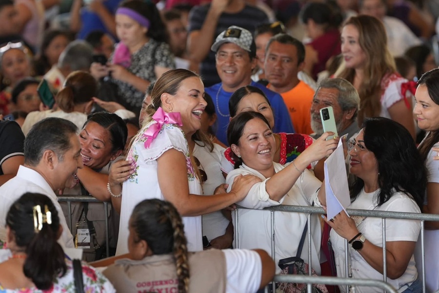Cecilia Patrón recibe el cariño de la gente en el informe de Claudia Sheinbaum en Xmatkuil