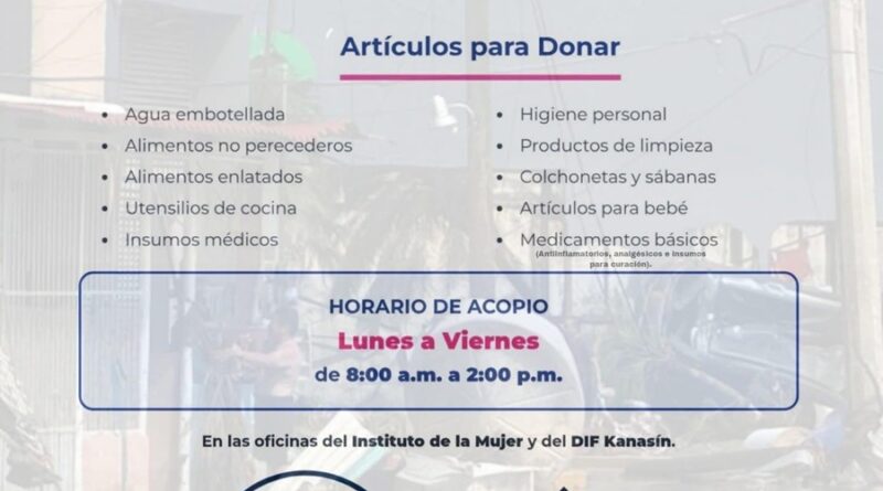La presidenta del DIF de Kanasín, Raquel Balam Rocha de Bojórquez, informó que los centros de acopio se han instalado tanto en las oficinas del DIF de Kanasín y en el Instituto Municipal de la Mujer en horarios de 8 de la mañana a 2 de la tarde de lunes a viernes.