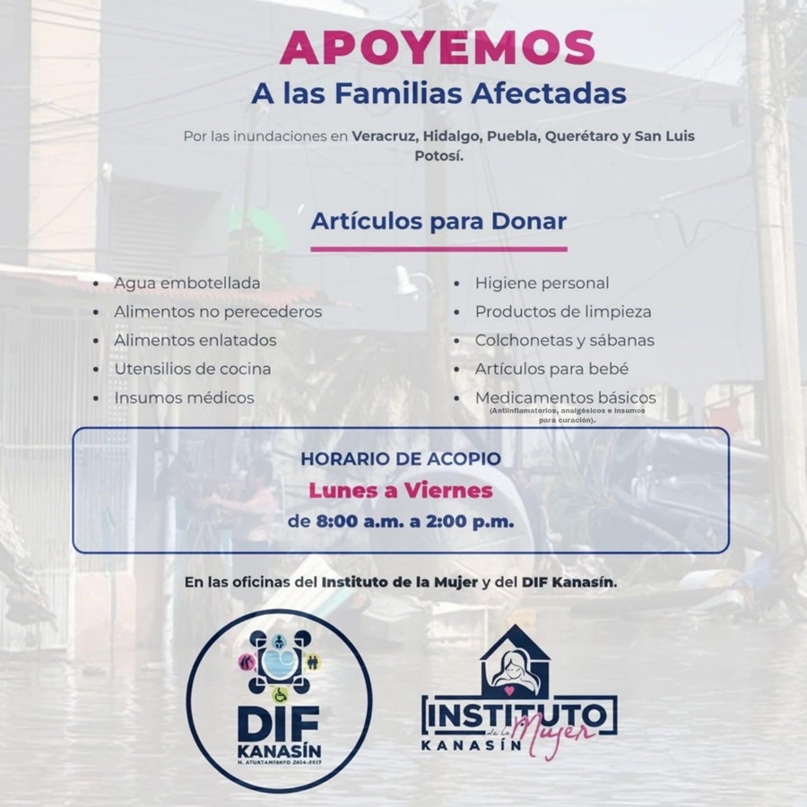 KANASÍN, Yucatán.- El DIF de Kanasín y el Instituto Municipal de la Mujer de Kanasín han instalado dos centros de acopio en el municipio para donación de víveres y productos en apoyo de las familias de Veracruz, Hidalgo, Puebla, Querétaro y San Luis Potosí que en los últimos días han sufrido severos daños y afectaciones por las fuertes inundaciones que se presentaron hace algunos días en esa zona del país.
