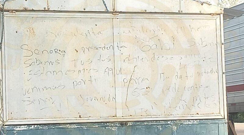 Señora presidenta Gabi, estamos aquí los zetas, venimos por ti, perra (insultos) y otras amenazas incluso de una advertencia de tiempo de 24 horas, es de lo poco que se alcanza a leer en el difuso mensaje.
